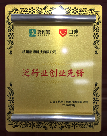 凭借启博旗下的客满SaaS系统,在线下KTV,休闲娱乐,酒店餐饮等行业快速拓展的能力,被支付宝口碑授予泛行业创业先锋称号。