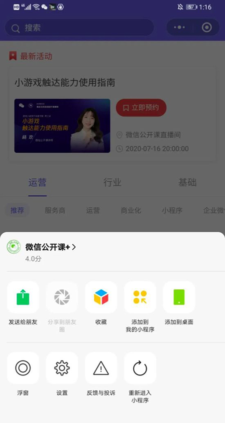 除此外,见实还打开了微信公开课的官方小程序,及更多小程序,发现“分享到朋友圈”按钮已经被明确显示出来,虽然暂时为灰色不可点击,这表明微信开放“小程序分享到朋友圈”功能的时间日近。