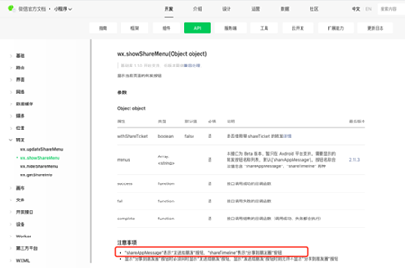 在微信开发者平台,和分享功能相关的官方文档已经做出更新。在这个转发分享相关的API文档“wx.showShareMenu”里,"shareTimeline"之意正是表示“分享到朋友圈”。