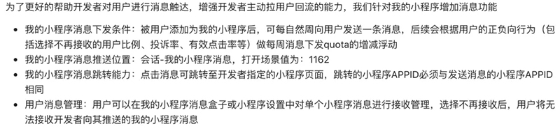 根据爆料人提供的截图,小程序可向用户推送消息这一功能“旨在帮助开发者对用户进行消息触达,增强开发者主动拉回用户回流的能力”。这意味着,小程序可以沉淀并且运营用户了。