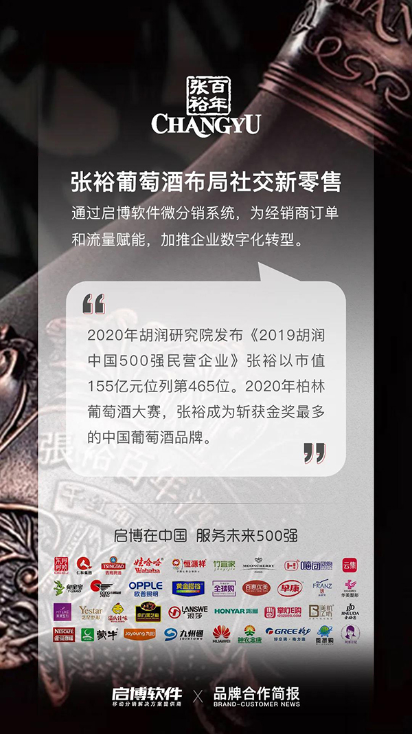 2020年5月1日,「张裕葡萄酒」微信商城正式上线,主打的就是社交电商,启博云为其提供技术支持。