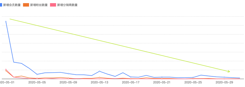 ① 【流量增长缓慢】上线第一天结合商城的首发活动,吸引了一批初始会员。然而,随着活动结束,公众号资源的逐步减少,仅靠自然流量导致会员新增出现断崖式下跌,且增长缓慢。
