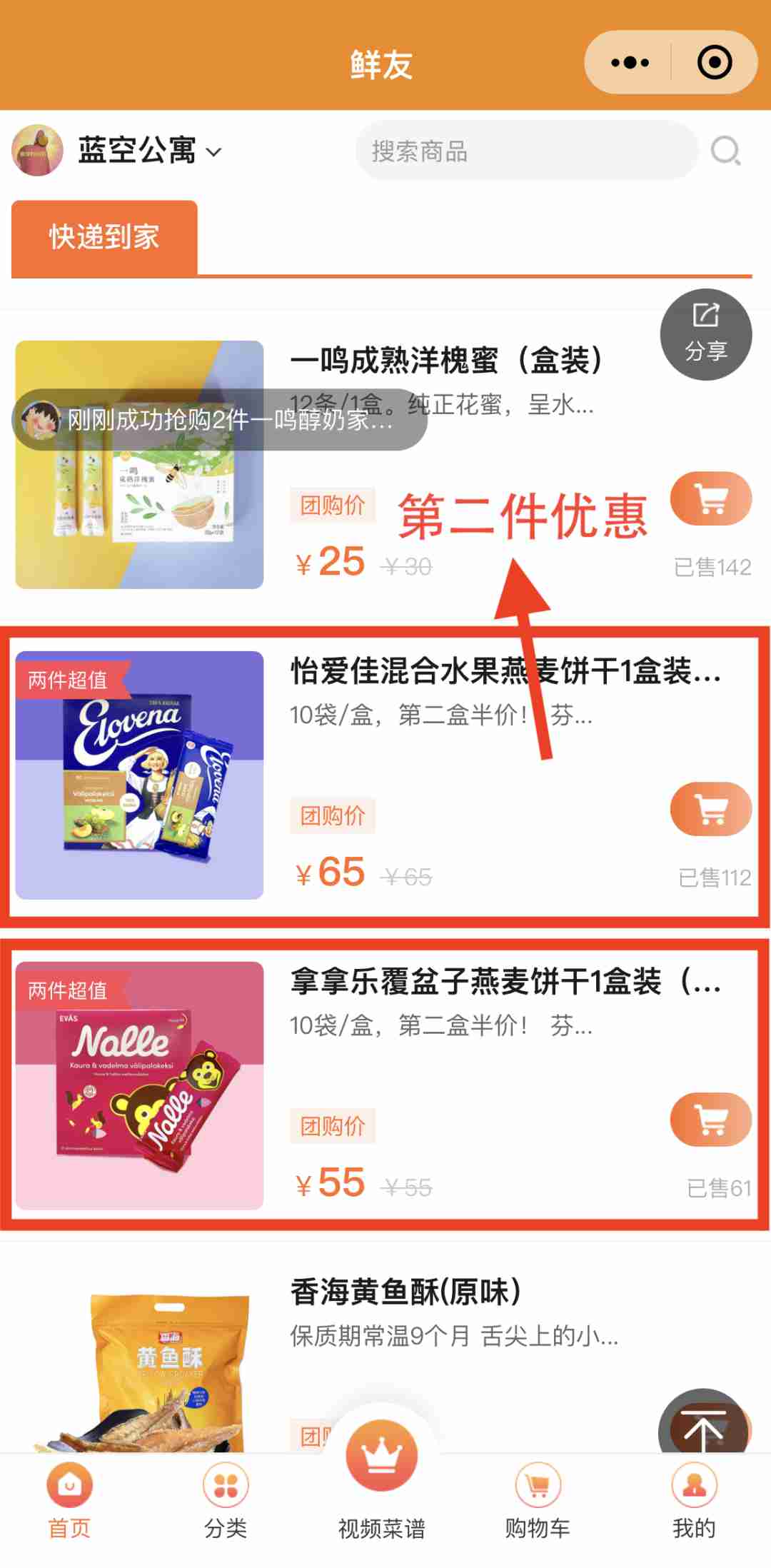 再如,148 元的商品砍价后折扣力度达到 50%,仅需 74 元即可购买,好友还能获得 30 元的无门槛优惠券,短短 2 天就引来了近 3000 的新客。