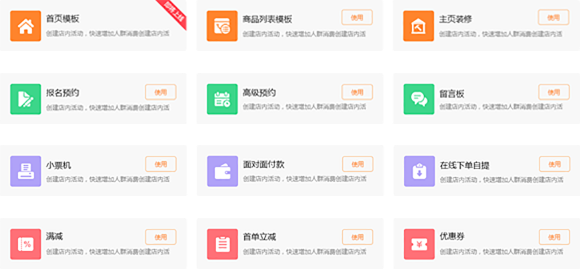 使用场景:酒店、丽人、餐饮等多行业特殊的行业组件,支持扫码点餐、房型预定等多种功能